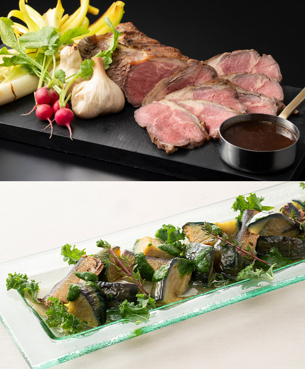 地元で採れた水ナスを使用した「泉佐野産水ナスとリンゴのビシソワーズ 酒粕香る柚子ソース」や「泉佐野産水ナスの洋風揚げびたし オイルサーディンとケールのジェノベーゼ」をはじめ、出来立てをご堪能いただけるオープンキッチンでは、「阿波黒牛もも肉のローストビーフ」(土日祝限定)を提供いたします。お子様からご年配の方まで幅広くご賞味いただける多彩な味わいをお楽しみください。