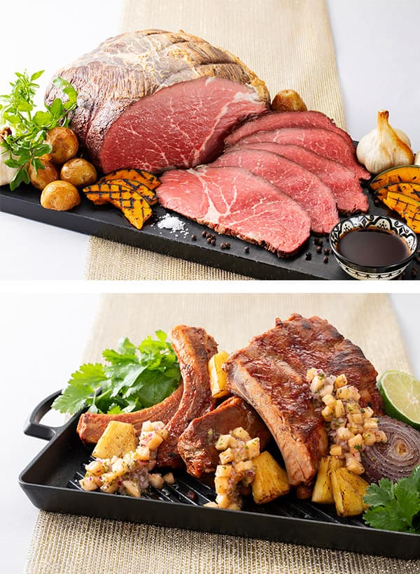わさびの爽やかな辛味が特徴のレフォールクリームソースで味わう「コールドビーフとトリュフ香るマッシュポテト」(土日祝限定)や、タイ風豚バラの唐揚げ「バックリブのムートート」などをご用意。さらにオープンキッチンでは、ローストビーフや牛肉のステーキをご提供いたします。